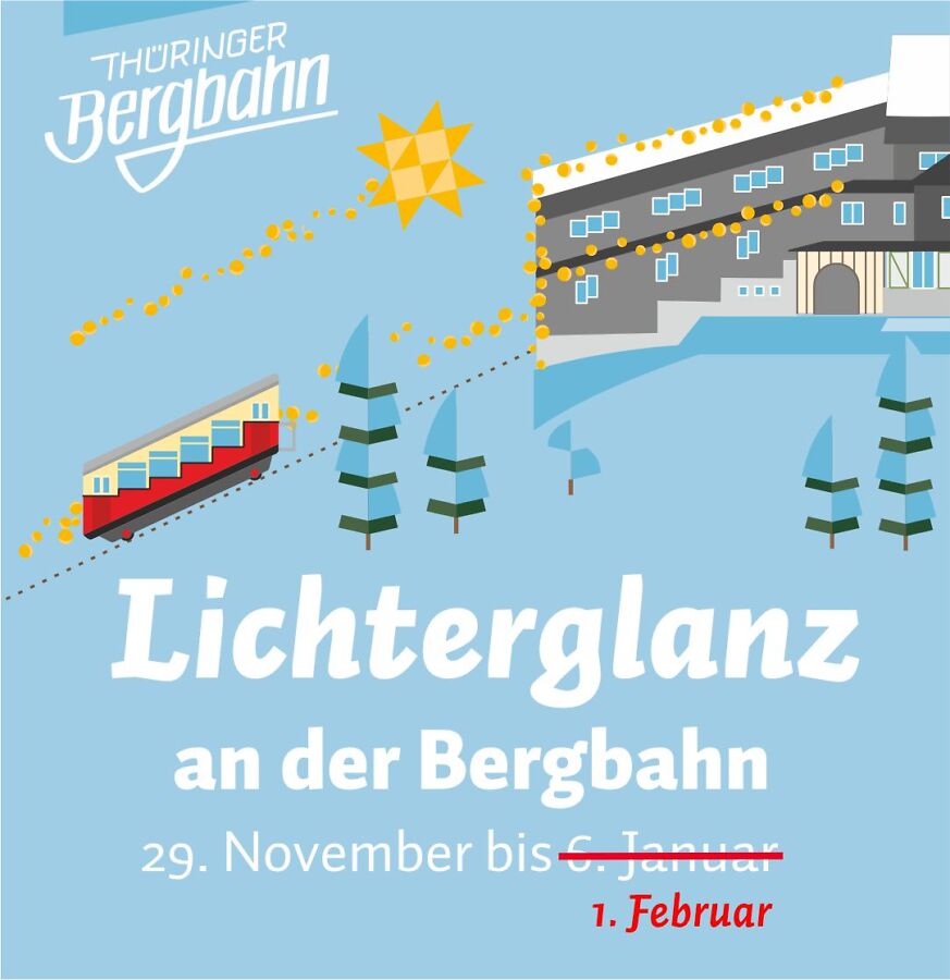 Genießen Sie noch bis zum 1. Februar 2026 unsere stimmungsvoll beleuchtete Steilstrecke der Thüringer Bergbahn - eine Bahnfahrt in den Abendstunden wird so zu einem besonders einmaligen Erlebnis.