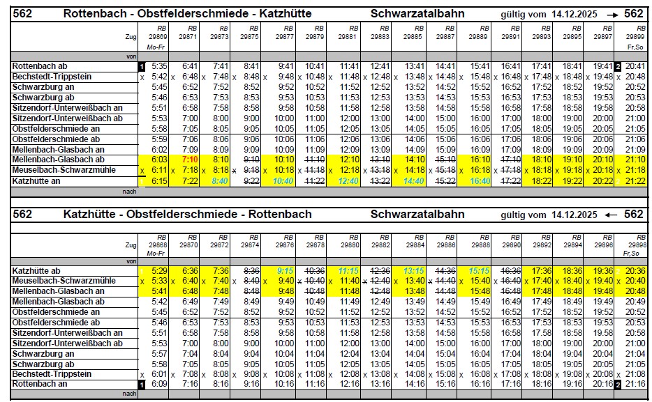 Bitte beachten: Aufgrund von Bauarbeiten auf der Strecke der Schwarzatalbahn verkehrt zwischen Mellenbach-Glasbach und Katzhütte ab Montag, 19. Januar bis einschließlich Samstag, 24. Januar Ersatzverkehr. Hinweis: Aufgrund von Holzfällarbeiten ist gleichzeitig die Straße zwischen Katzhütte und Schwarzmühle von 08:00 bis 16:00 Uhr gesperrt. Der Ersatzverkehr muss daher eine Umleitung fahren und kann die Haltepunkte nur im 2-Stunden-Takt bedienen. Bitte beachten Sie außerdem die geänderten Abfahrts- und Ankunftszeiten in Katzhütte sowie die Aushänge zu den Standorten der Ersatzhaltestellen an den Haltepunkten! Die Fahrradbeförderung ist im Ersatzverkehr nur begrenzt möglich! Der Ersatzverkehr ist im Fahrplan gelb markiert.