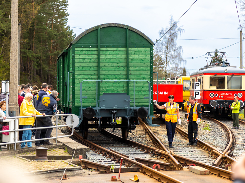 Um 13.16 Uhr trifft pünktlich wie immer die Güterbühne mit dem geschlossenen Aufsatzwagen in Lichtenhain ein. Umrahmt von fachkundiger Moderation kann man anschließend das Auf- und Absetzen sowie den Huckepack-Transport eines Güterwagens verfolgen.