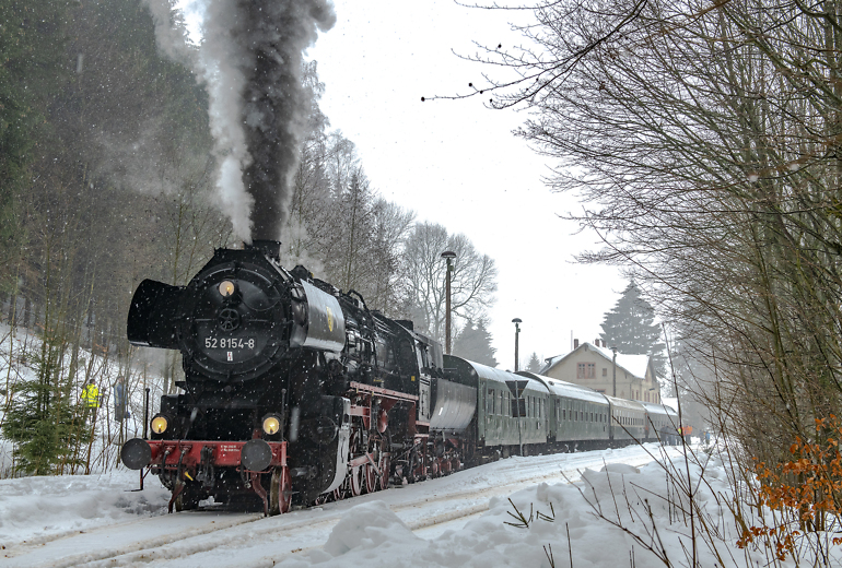 Tauchen Sie ein in eine festliche Welt mit weihnachtlich geschmückten Bahnhöfen, einer im Lichterglanz erstrahlenden Bergbahn. Der Zug bringt Sie auf einer malerischen Strecke nach Katzhütte. Es geht es über Naumburg, Dornburg und Jena nach Saalfeld. Dort wird Wasser genommen und sich mit gedrehter Lokomotive auf die kurven- und steigungsreiche Strecke nach Obsfelderschmiede und Katzhütte aufgemacht.